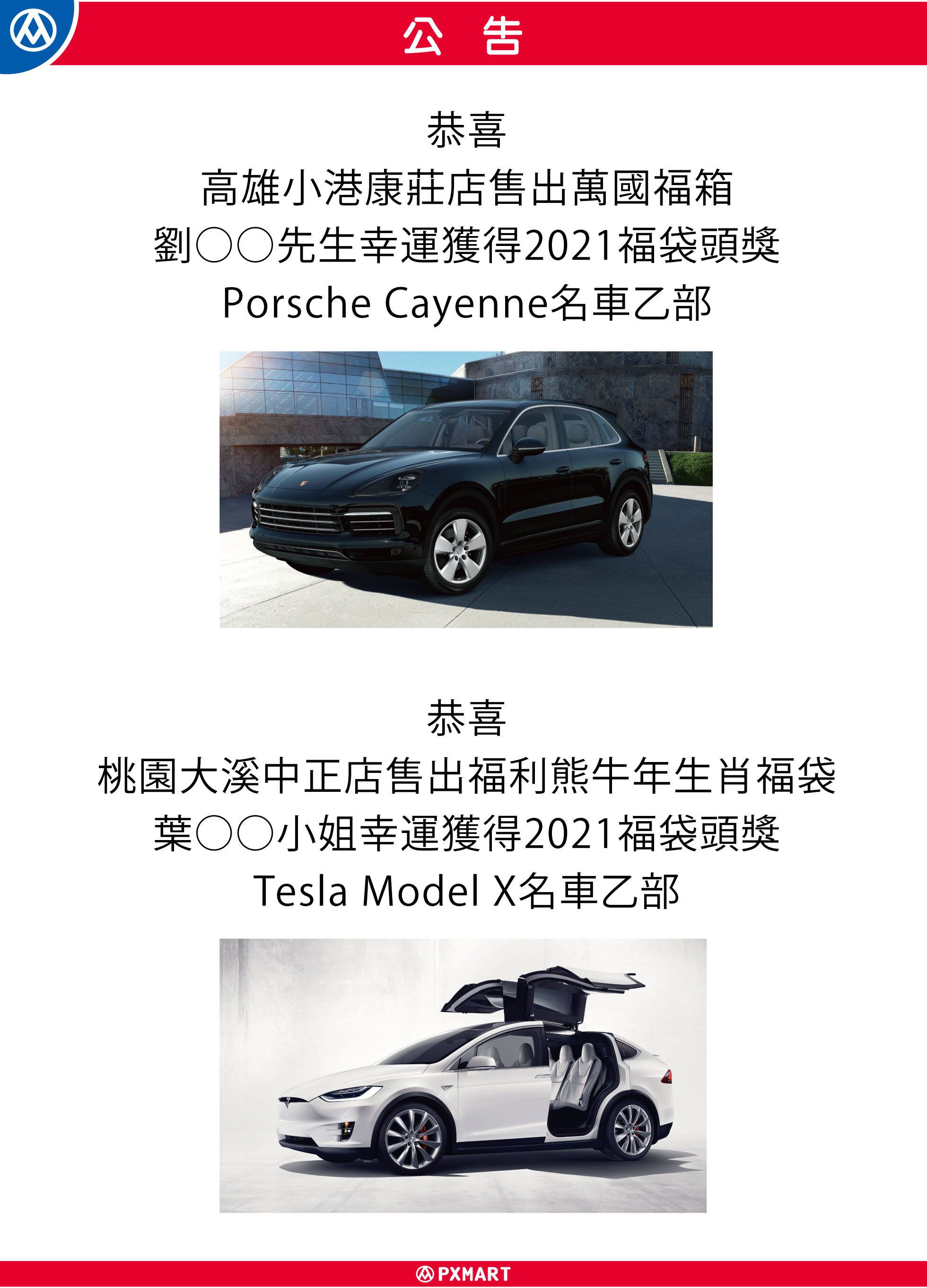 【公告】2021福袋頭獎Porsche/Tesla領獎公告