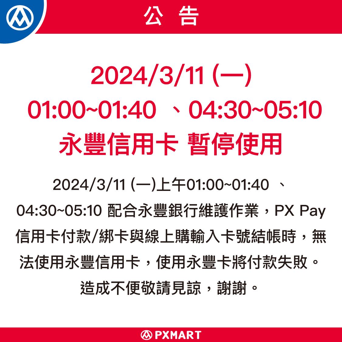 【公告】2024/3/11 (一) 01:00~01:40 、04:30~05:10永豐信用卡暫停使用