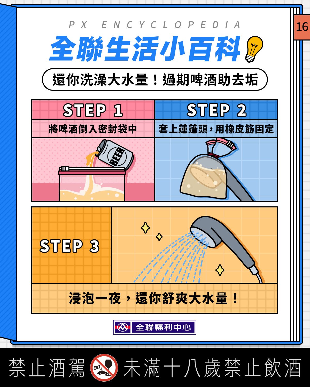 還你洗澡大水量!過期啤酒助去垢2023-05-17分享【 #全聯生活小百科:還你洗澡大水量!過期啤酒助去垢】Party 後,罐裡總還剩半滿啤酒丟掉?浪費!喝掉?打咩 你該做的,是拿它來去垢 一起看看過期啤酒的妙用小撇步 Step1:把過期啤酒倒入密封袋中,約至 1/3 滿Step2:將其套上蓮蓬頭,並用橡皮筋固定Step3:浸泡一夜除水垢,快樂洗澡水量夠 #大水量就是舒服#過期啤酒真好用#全聯 #全聯福利中心#來全聯讓生活更輕鬆